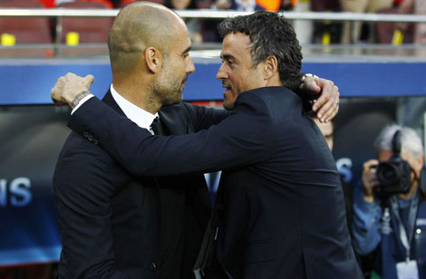 | Luis Enrique và đồng đội cũ Pep Guardiola. |