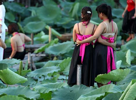 Xoay bên này xoay bên kia, ngửa mặt rồi lại cúi đầu, tiếng cười nói xôn xao. Thỉnh thoảng có nhóm táo bạo nhảy ùm xuống hồ cho áo yếm bám vào da thịt, lồ lộ bộ ngực thả rông, vô tư cười đùa trước ống kính. Choáng nhất với một cậu thanh niên trên đầu một chỏm tóc vàng rực, cũng thắt chiếc áo yếm ngang eo, đội luôn cả chiếc khăn vấn tóc trên đầu, nhái hình ảnh các bà, các cô thời xưa, đứng xệch một bên hông giả bộ cười chúm chím.