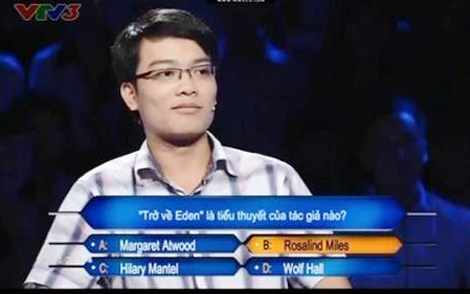 Câu hỏi về tác phẩm văn học "Trở về Eden" là của tác giả nào? Có 4 phương án lựa chọn: A: Margaret Atwood, B: Rosalind Miles, C: Hilary Mantel, D: Wolf Hall. Người chơi phân vân giữa A và C nên đã sử dụng sự trợ giúp hỏi tổ tư vấn tại chỗ. Các khán giả lần lượt giơ tay để tư vấn cho người chơi. 2 khán giả đầu tiên là phụ nữ và đều chọn phương án A, ai cũng chắc chắn là mình chọn đúng, thậm chí một khán giả nữ còn khẳng định là mình đã đọc cuốn này 3 lần rồi. Vị khán giả thứ 3 trợ giúp là khán giả nam, anh chọn phương án B. Và khá ngạc nhiên, người chơi đã không nghe theo số đông mà quyết định chọn phương án B: Rosalind Miles. Bất ngờ hơn cả là khi người dẫn chương trình công bố B là đáp án chính xác, cả trường quay như vỡ òa.
