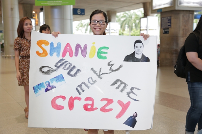 | Gần 100 người hâm mộ Shane Filan đã tập trung ở sân bay Tân Sơn Nhất, cùng giơ cao những biểu ngữ, cờ, băng rôn, hình vẽ chào mừng và thể hiện tình cảm với Shane Filan - Ảnh: BTC cung cấp. |