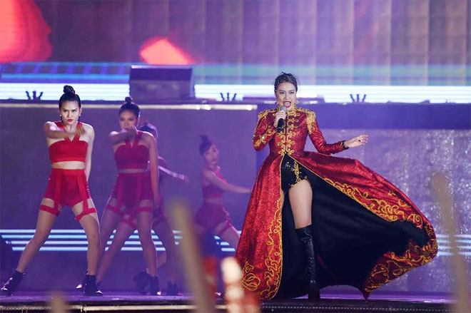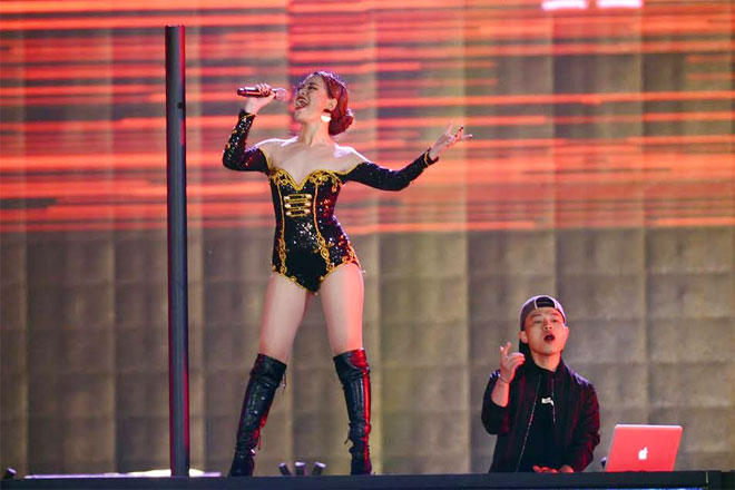 Thu Minh lại khiến người xem choáng váng với màn 'bay trên mọi người'. “Nữ hoàng nhạc dance” đem đến chương trình những bản hit sối động như Bay, Xinh & Just Love làm bùng nổ Sân vận động Mỹ Đình.