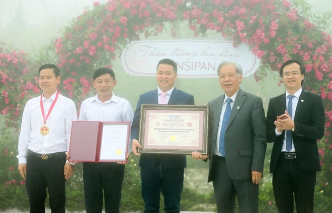| Ông Nguyễn Xuân Chiến – Giám đốc khu du lịch Sun World Fansipan Legend (giữa) nhận kỷ lục Thung lũng hoa hồng lớn nhất Việt Nam. |