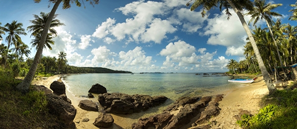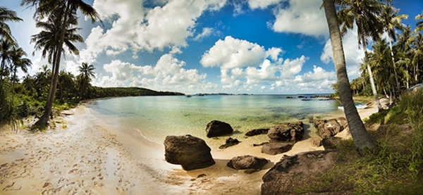 Trải dài thoai thoải hình vòng cung với một viền cát trắng nổi bật giữa màu xanh cây rừng và biển khơi lồng lộng, bãi Khem là một trong những bãi biển đẹp nhất Phú Quốc.
