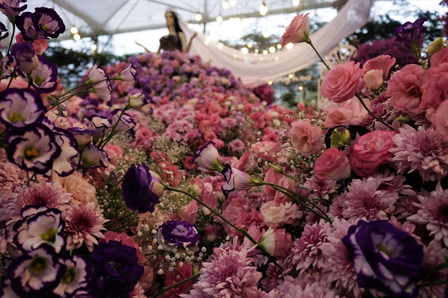 Chiếc váy này do một doanh nghiệp tại TP Đà Lạt huy động khoảng 20 người cắm hoa lành nghề, thực hiện liên tục trong vòng 3 giờ đồng hồ. Váy hoa có chiều cao 3m, dài 7m được làm hoàn toàn bằng hoa tươi Đà Lạt với gam màu hồng chủ đạo.
