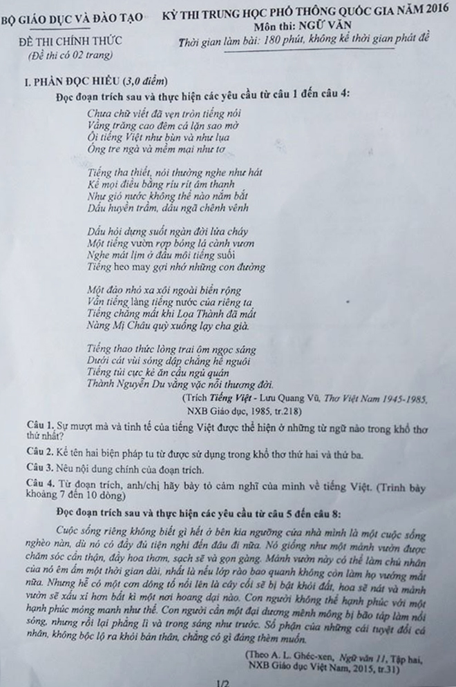 Về nội dung Phần đọc hiểu: Trích đoạn thơ trong bài thơ “Tiếng Việt” của Lưu Quang Vũ được Hội đồng ra đề thi trích dẫn từ bài thơ “Tiếng Việt” của nhà thơ Lưu Quang Vũ trong cuốn Thơ Việt Nam 1945-1985 (Ban tuyển chọn và chú giải: Nguyễn Đức Nam (chủ biên), Bằng Việt, Nguyễn Văn Long, Nguyên An, Nguyễn Quốc Túy); Nhà xuất bản Giáo dục - 1985 (sách được xuất bản trong thời gian nhà thơ Lưu Quang Vũ còn sống). Nội dung trích dẫn: