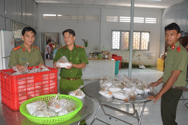 | Công an huyện Mỹ Tú chuẩn bị cơm cho TS đi thi ở xa. |