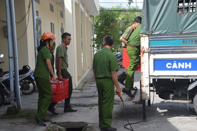 | Công an huyện Mỹ Tú đưa cơm trưa đến các điểm thi. |
