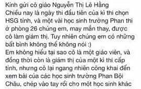 Cụ thể từ ngày 14 đến ngày 15-3, tại Trường THPT Lê Viết Thuật, TP Vinh, Nghệ An) tổ chức kỳ thi cấp tỉnh (2016 – 2017). Điều đáng nói, trong lúc các thí sinh đang tiến hành làm bài thì cô giáo Hằng đã xem bài của một thí sinh Trường THPT Chuyên Phan Bội Châu rồi chép vào tay và cho một bạn khác ghi lại.
