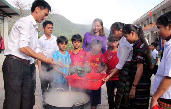 Tiếp lời chị Men, thầy Hoàng Đình Tuấn, Phó Hiệu trưởng phụ trách nhà trường bộc bạch: “Trường có hơn 300 học sinh thì có đến 112 học sinh bán trú, vì nhà ở xa trường. Trong các năm học ở đây, việc ăn ở, sinh hoạt và học tập gần như được gia đình giao cho nhà trường chúng tôi. Các con ở đây cũng như một gia đình. Cứ mỗi năm đến tết, nhà trường đều tổ chức cho các cháu một bữa cơm tất niên để các cháu về nhà ăn tết. Niềm vui của chúng tôi là các cháu chăm ngoan và học tập tốt. Chúng tôi rất xúc động khi nhận được sự quan tâm của các bậc phụ huynh. Mong rằng tình cảm này sẽ tiếp tục gắn kết hơn ở những cái Tết sau nữa”.
