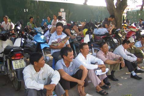 | Phụ huynh chờ đợi con làm bài thi dưới thời tiết nắng nóng. |