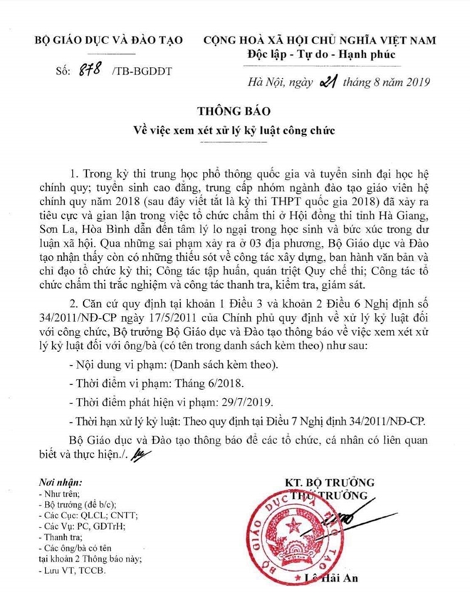 Trong Thông báo 878 ban hành ngày 21-8-2019, Bộ GD & ĐT cho rằng, trong kỳ thi THPT quốc gia và tuyển sinh đại học chính quy năm 2018, đã xảy ra tiêu cực và gian lận trong tổ chức chấm thi ở Hà Giang, Hòa Bình, Sơn La, dẫn đến tâm lý lo ngại trong học sinh và bức xúc trong dư luận.