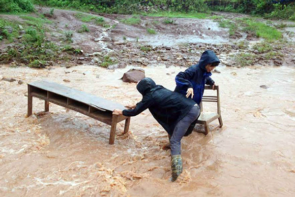 | Trong đợt lũ 2017, bàn ghế đã bị mưa lũ cuốn trôi, các thầy cô giáo ở huyện Mộc Châu (Sơn La) đã phải tự bê vác, vận chuyển những bộ bàn ghế mới cho các em học sinh có chỗ ngồi học. |