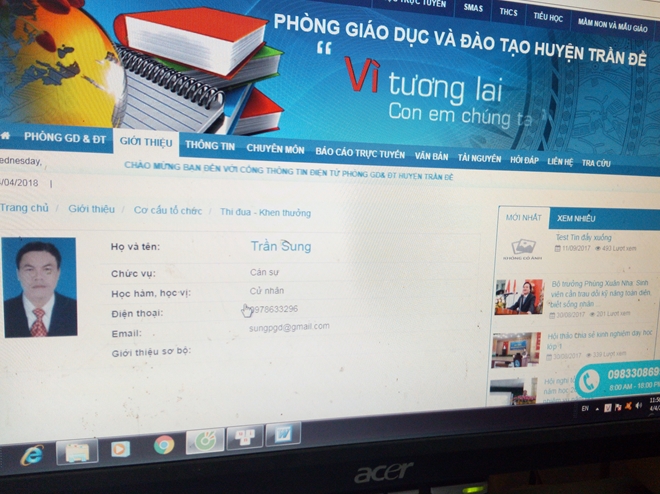 Tra cứu trên website của Phòng GD&ĐT huyện Trần Đề, chúng tôi thấy cả 5 GV nói trên đều được xếp chức vụ là “cán sự”, trong đó GV Trang Thanh Tới phụ trách 2 lĩnh vực là Kiểm tra và Giáo dục THCS; GV Trần Sung phụ trách Thi đua – Khen thưởng; GV Đinh Thư phụ trách 2 lĩnh vực là Giáo dục Tiểu học và Giáo dục Dân tộc; GV Chung Ngọc Minh phụ trách Giáo dục Tiểu học; GV Phạm Văn Cường phụ trách lĩnh vực Giáo dục thường xuyên.