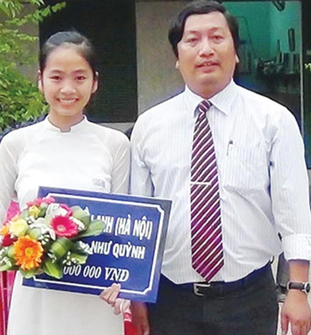 Thầy giáo Lê Triều Sơn trao học bổng cho em Như Quỳnh, học sinh nghèo vượt khó, học giỏi. |