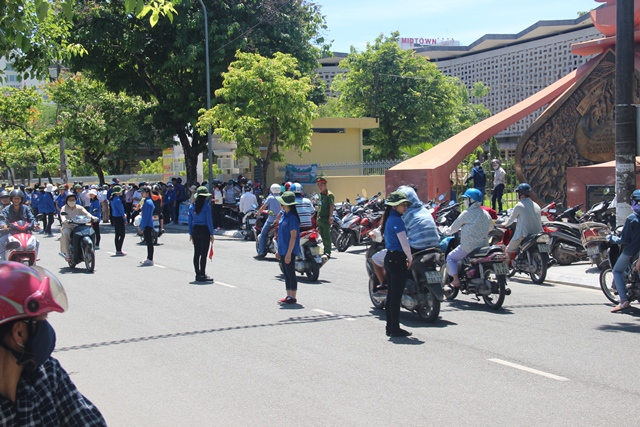 | Lực lượng tình nguyện viên và CBCS Công an TP Huế được huy động để bảo đảm ANTT, ATGT tại các điểm thi THPT quốc gia tại Huế. |
