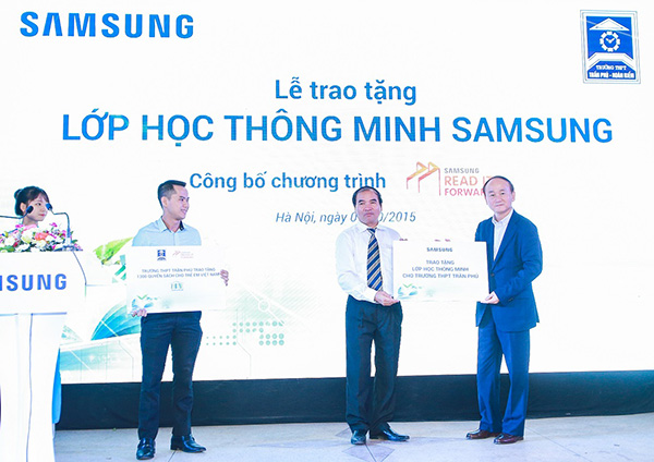 | Ông Han Myeong Seop – Tổng Giám đốc Samsung Complex trao tặng Lớp học thông minh cho thầy Phạm Đức Doanh - Hiệu trưởng Trường THPT Trần Phú, Hà Nội. |