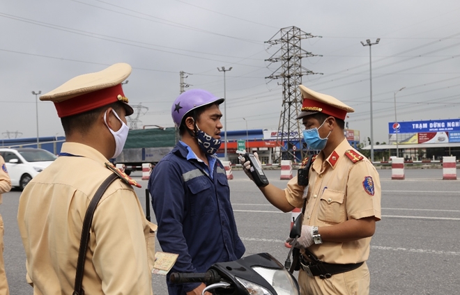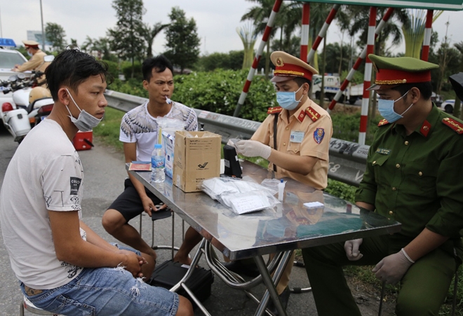 | Cán bộ CSGT kiểm tra nồng độ cồn lái xe. |