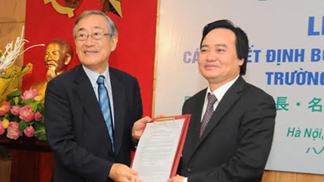 | Bộ trưởng Phùng Xuân Nhạ trao quyết định bổ nhiệm hiệu trưởng cho ông Furuta Motoo. |