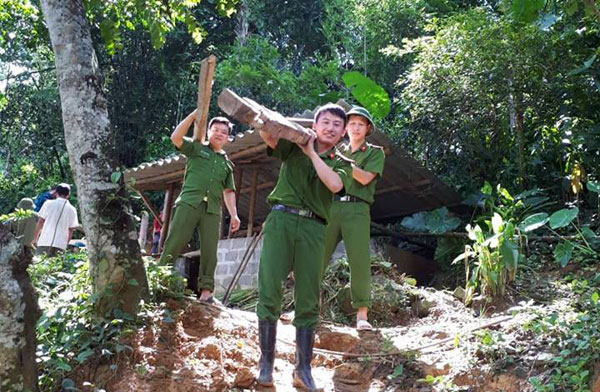 | Công an huyện Lạc Sơn giúp dân dựng nhà sau mưa lũ. |
