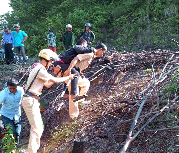 Các cán bộ, chiến sĩ CSGT đã nhanh chóng xuống vực sâu tìm và phát hiện anh Ôn bị thương tích, nằm bất tỉnh trong lùm cây nên thay nhau cõng lên đường chuyển đi bệnh viện cấp cứu.