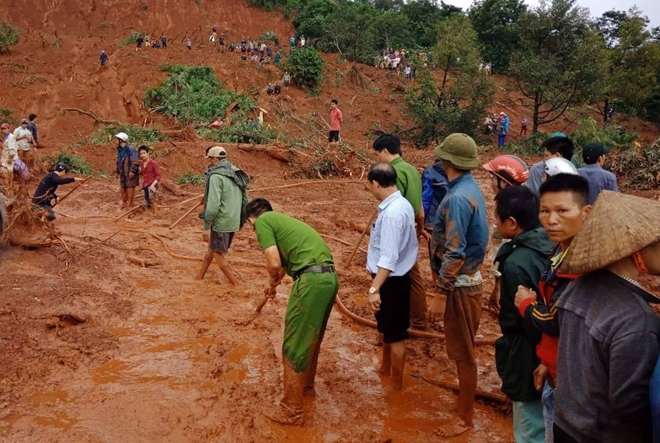 | Hàng trăm cán bộ, chiến sỹ Công an, Quân đội, Dân quân và người dân nỗ lực tìm kiếm thi thể gia đình anh Hiệu trong vụ sạt lở |