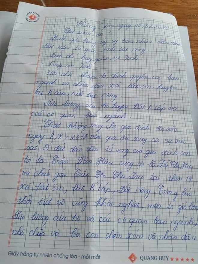 “Trong mất mát, đau thương, gia đình chúng tôi đã nhận được sự tận tình vô cùng quý báu của các cơ quan, đoàn thể, bà con của xã, huyện, tỉnh Đắk Nông. Trước sự quan tâm đó, gia đình chúng tôi xin chân thành cảm ơn đến Đảng uỷ, UBND, HĐND, Ban Chỉ huy Quân sự, lực lượng Công an, cứu hộ của tỉnh, huyện, xã và các mạnh thường quân đã giúp đỡ…”, đoạn thư viết.