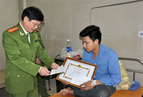 Sáng 14/3, Đại tá Đinh Quang Vinh, Phó Giám đốc Công an tỉnh Ninh Bình đã đến thăm, tặng quà anh Nguyễn Minh Hoằng với số tiền 10 triệu đồng, được trích từ quỹ “Đền ơn đáp nghĩa” của Công an tỉnh Ninh Bình, đã dũng cảm bắt cướp.