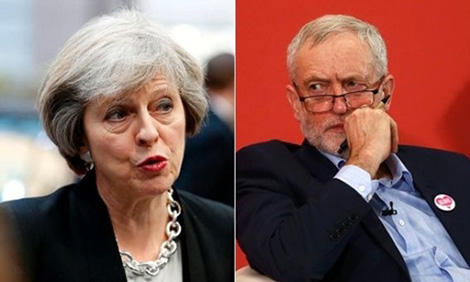 | Bà Theresa May (đảng Bảo thủ) và ông Jeremy Corbyn (Công đảng). |