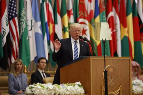 | Tổng thống Donald Trump đọc diễn văn trước hơn 50 nhà lãnh đạo Arập và Hồi giáo hôm 21-5. |