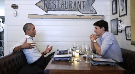 Hai tay áo xắn cao, không đeo cà vạt, bên ngọn nến lập lòe trong không gian ấm cúng của nhà hàng hải sản Liverpool House ở Montreal, hai người bạn cũ gặp lại nhau trò chuyện, thưởng thức món hàu nướng, sườn bít tết và cá lưỡi ngựa đặc sản Nova Scotia của Canada. Đó là cuộc tái ngộ giữa cựu Tổng thống Mỹ Barack Obama với Thủ tướng Canada Justin Trudeau hôm 30-5.
