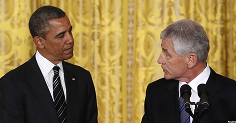 Tổng thống Barack Obama sa thải Bộ trưởng Quốc phòng Chuck Hagel (bên phải) tháng 2-2015 cũng vì bất đồng trong vấn đề đóng cửa Guantanamo.