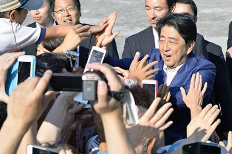 | Thủ tướng Shinzo Abe giữa vòng vây người ủng hộ. |