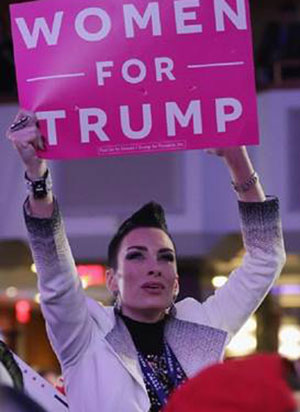 | Một phụ nữ giơ cao khẩu hiệu "Phụ nữ ủng hộ Trump" tại New York. |