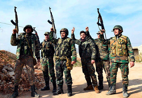 Quân chính phủ ăn mừng chiến thắng đường M5, ngoại vi Aleppo, Syria.