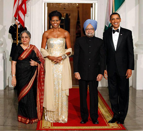 Michelle Obama mặc trang phục của nhà thiết kế Ấn Độ Naeem Khan để dự dạ tiệc với Thủ tướng Ấn Độ Manmohan Singh năm 2009.