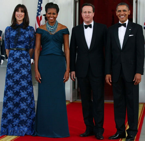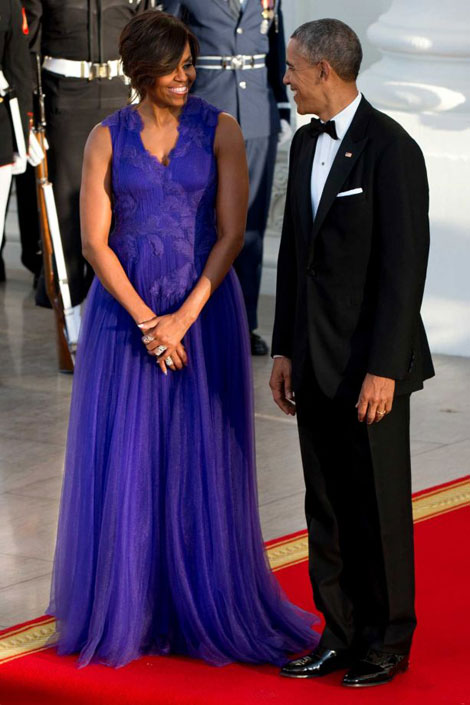 Michelle Obama mặc chiếc áo dài của thương hiệu Marchesa - do 2 nhà thiết kế người Anh lập ra ở New York - khi Nhà Trắng tổ chức Quốc tiệc chiêu đãi Thủ tướng Anh David Cameron và phu nhân Samantha Cameron.