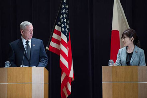 | Bộ trưởng Quốc Phòng Nhật Tomomi Inada (phải) trong cuộc họp báo với đồng nhiệm Mỹ James Mattis, ngày 4-2-2017, tại Tokyo. |
