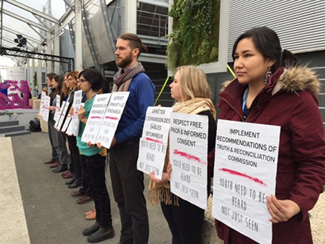 | Thành phần bảo thủ phản đối Justin Trudeau tại Hội nghị COP21 ở Paris, Pháp. |