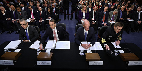 | Từ phải sang: Giám đốc NSA Mike Rogers, Giám đốc Tình báo quốc gia Dan Coats và Thứ trưởng Bộ Tư pháp Rod Rosenstein tại một cuộc điều trần. |