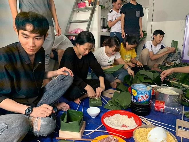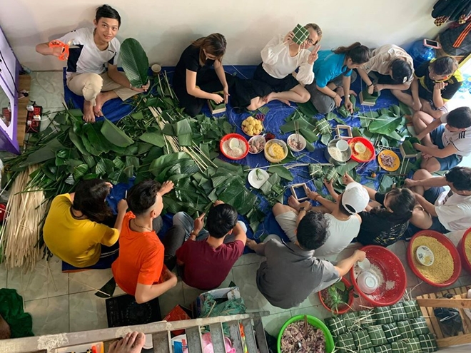 | Các bạn trẻ cùng nhau gói bánh chưng |