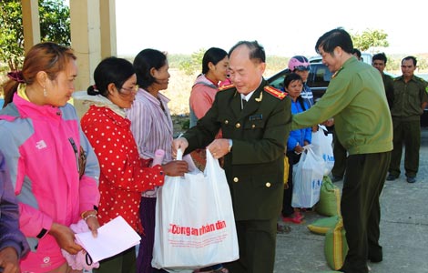| Đại tạ Trần Kim Thẩm, Phó Tổng biên tập Báo CAND trao quà tặng bà con. |
