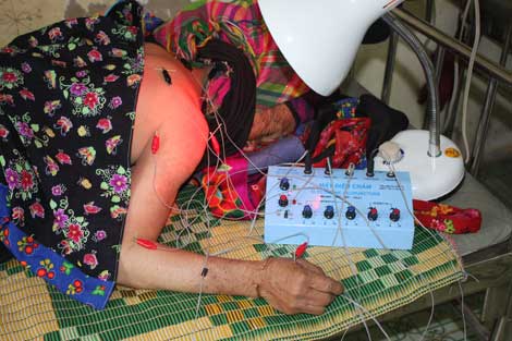 | Một trong những phương pháp chữa bệnh không dùng thuốc của Y học Cổ truyền, phương pháp điện châm dùng đèn hồng ngoại. |