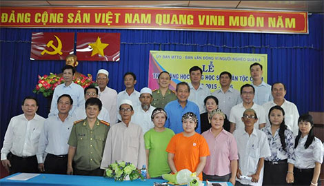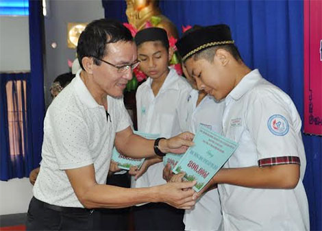 | Ông Lâm Tấn Lợi, Giám đốc Công ty Duy Lợi trao học bổng động viên con em đồng bào Chăm. |