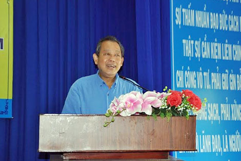 | Đồng chí Trương Hòa Bình phát biểu chia sẻ và động viên các em học sinh, sinh viên người dân tộc Chăm phường 1, quận 8, TP HCM. |