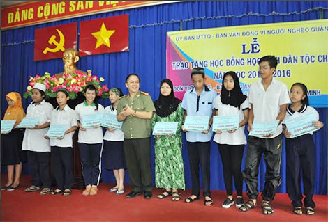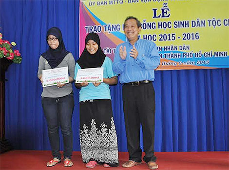 Đã có 129 suất học bổng được trao tận tay các em học sinh tiểu học, phổ thông cơ sở, phổ thông trung học, sinh viên đại học và cao học vượt khó học giỏi, đang sinh sống, học tập trong cộng đồng người Chăm tại quận 8. Trong đó, thông qua Quỹ bảo trợ học sinh nghèo dân tộc thiểu số của Báo CAND, Công ty Duy Lợi hỗ trợ 50 triệu đồng, Báo Công an TP HCM trao 50 triệu đồng. Nhân dịp này, dược sĩ Nguyễn Minh Phương - phu nhân đồng chí Trương Hòa Bình và con cháu đã trao tặng 50 triệu đồng cho Quỹ vì người nghèo phường 1, quận 8.