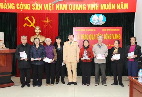 | Thượng tá Nguyễn Ngọc Mẽ – Phó Trưởng phòng CSGT– CATP Hà Nội trao những suất quà tặng các cựu chiến binh, thanh niên xung phong. |