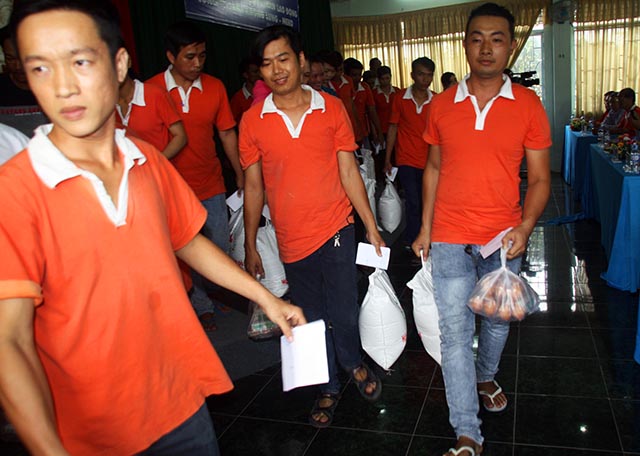Niềm vui của công nhân khi được nhận hỗ trợ.