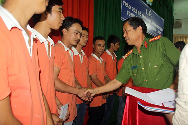 Đại tá Võ Văn Thăng, Phó Giám đốc Công an TP Cần Thơ trao quà cho công nhân Công ty Kwong Lung – Meko.