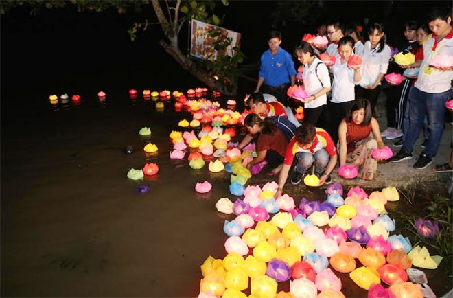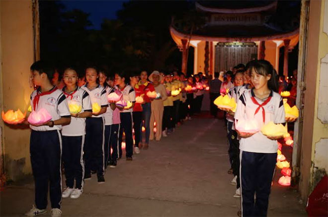 Các em học sinh xã Lương Hoà tham gia thả đèn hoa đăng tri ân anh hùng liệt sĩ. |