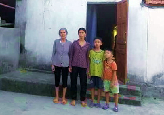 | Mẹ, vợ và các con anh Tuyển trước căn nhà dột nát. |